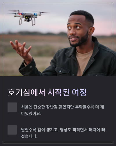 처음엔 단순한 비행이었는데, 어느 순간부터는 예쁜 풍경을 담고 싶어졌어요. 그래서 액션캠을 달아 촬영을 시작했죠. 편집까지 해보니 영상 제작이 이렇게 재미있는지 몰랐습니다.