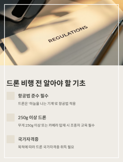 국내에서는 무게 250g 이상 또는 카메라가 탑재된 드론을 조종할 경우, 조종자 교육 수료가 필수입니다.