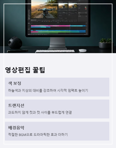 배경음악: 적절한 BGM만 깔아줘도 항공샷이 한층 드라마틱해집니다.