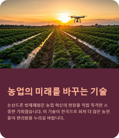 짧은 시간이었지만, 논산드론 방제 현장을 직접 체험해본 건 제게 큰 깨달음을 안겨줬습니다. 단순히 “드론 = 촬영용”이라는 고정관념이 확 깨져버렸죠. 딸기농장 같은 곳에서 인력·시간을 절약하고 건강 위험을 줄여주는 역할을 톡톡히 하고 있으니, 앞으로 더욱 확산되지 않을까 싶습니다. 특히 협업농가 모델은 “고가 장비를 여러 농민이 공유한다”라는 이점이 커 보이더라고요.