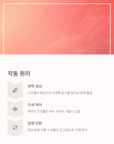 양력 생성: 각 프로펠러는 회전하며 아래쪽으로 공기를 밀어내어 양력을 생성합니다.