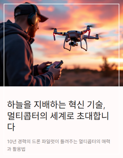 오늘은 제가 직접 경험한 멀티콥터의 매력과 활용법에 대해 여러분과 나누고자 합니다.