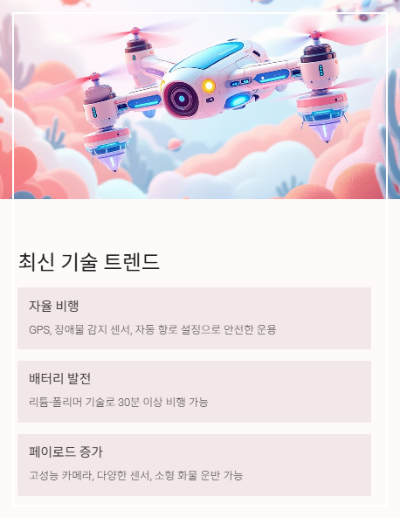 하지만 최신 모델들은 GPS, 장애물 감지 센서, 자동 항로 설정 등 고급 자율 비행 기능을 갖추고 있어 훨씬 안전하고 간편하게 운용할 수 있습니다.