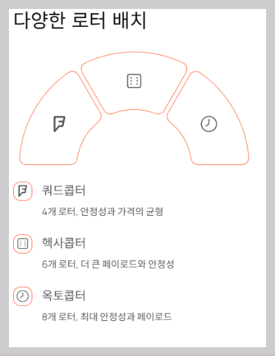 쿼드콥터(4개): 가장 보편적인 형태로, 안정성과 가격 사이의 균형이 좋습니다.