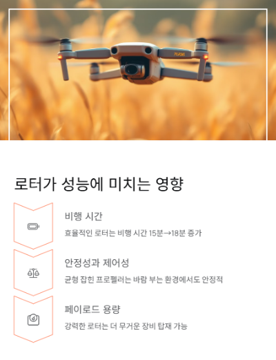 안정성과 제어성 로터의 반응 속도와 토크는 드론의 안정성과 조종성에 직접적인 영향을 줍니다.