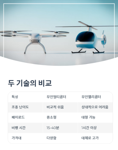 무인멀티콥터와 무인헬리콥터는 각각 고유한 장단점을 가지고 있어 용도에 맞게 선택하는 것이 중요합니다.