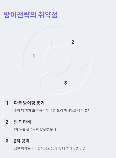 수백 대의 저가 자폭 드론이 한꺼번에 공격한다면? 비싼 요격 미사일로는 감당 불가. 경제성 전쟁에서도 밀릴 수 있습니다.