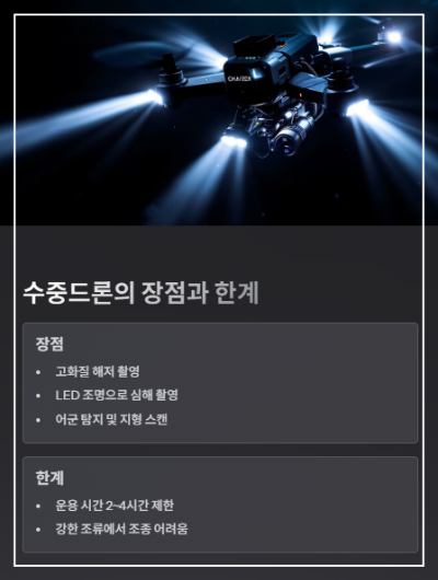 수중드론은 단순한 수중촬영 장비를 넘어 해양 과학, 수산업, 환경 조사 등 다양한 분야에서 활용되고 있습니다.