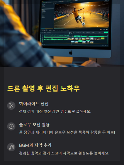 드론 촬영 후 편집 꿀팁 하이라이트 편집: 전체 경기 영상 대신 멋진 장면 위주로 편집