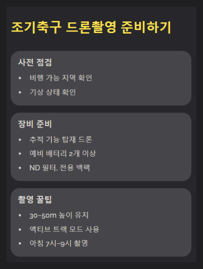 ✅ 촬영 꿀팁 30~50m 높이 유지: 전체 경기장과 움직임을 자연스럽게 담을 수 있음