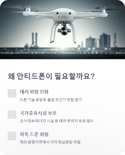 드론이 많아지고, 가격도 싸지고, 심지어 자폭용 개조도 가능해지면서, 테러 조직이 이 기술을 악용할 위험이 늘어나고 있습니다. 이런 현실에서 안티드론 방어가 확실해야 국가중요시설을 지켜낼 수 있다는 인식이 전 세계적으로 확산 중이죠.