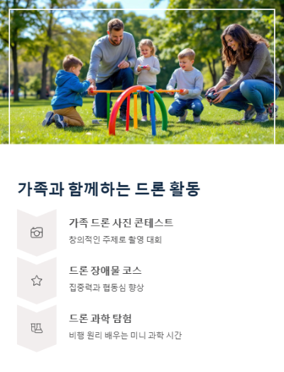 가족 드론 사진 콘테스트 ‘우리 집 하늘에서 보기’, ‘가장 멋진 장소’ 등을 주제로 촬영 대회를 열어보세요. 자연스럽게 아이의 창의력과 관찰력이 자랍니다.