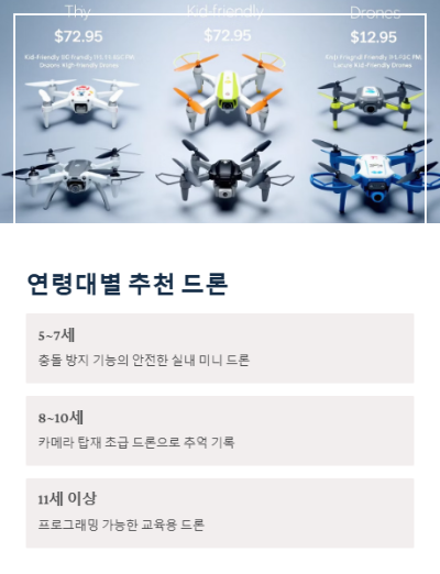 📊 연령대별 추천 드론 가이드 5~7세: 입문용 실내 드론 충돌 방지 기능과 튼튼한 내구성을 갖춘 미니 드론이 적합합니다. 조작이 쉬워 아이들이 안전하게 즐길 수 있어요.