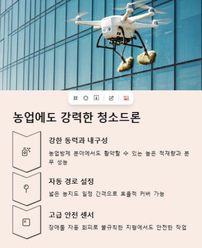 보통 농업용 드론은 살포 용량과 출력에 집중하지만, 청소드론은 농업방제 분야에서도 활약할 만한 강한 동력과 내구성을 갖췄다고 합니다.