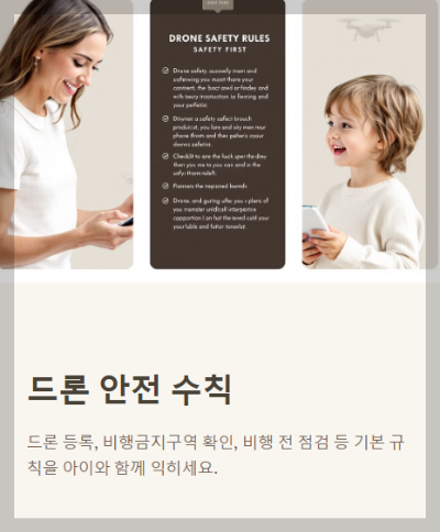 안전 수칙 꼭 숙지하기 드론 등록, 비행금지구역 확인, 비행 전 점검 등 기본 규칙을 아이와 함께 익히세요.