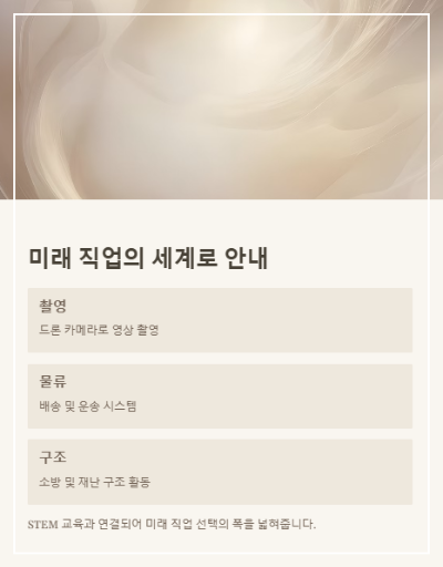 미래 직업 세계에 대한 눈뜨기 드론은 촬영, 농업, 물류, 소방, 구조 등 다양한 산업 분야에서 활약하고 있습니다.