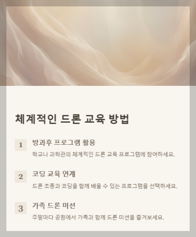 체계적인 교육 활용하기 방과후 프로그램, 과학관, 드론 캠프 등 다양한 기관에서 체계적인 드론 교육을 제공합니다. 우리 아이는 '주니어 드론 스쿨'에 참여해 기본 조종부터 미션 수행, 코딩까지 단계별로 배울 수 있었어요.
