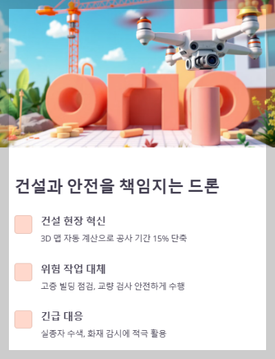 고층 빌딩 점검, 교량 검사, 3D 지도 제작 등 기존에 사람이 직접 해야 했던 위험 작업을 드론이 대신합니다.