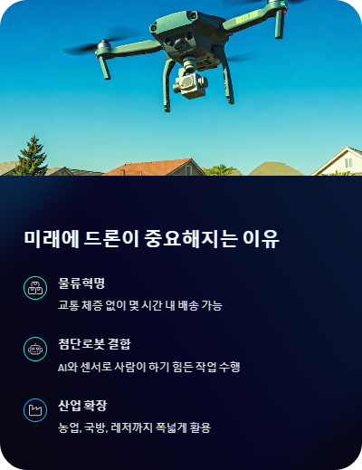 특히 배송, 농업, 건설, 보안, 레저 등 다양한 영역에서 “없으면 불편하다”는 말이 나올 정도로 점차 필수화되고 있죠. 즉, 미래에드론이 주도할 “하늘 경제”가 점차 현실화되고 있으며, 앞으로 물류혁명까지 예고하는 셈입니다.