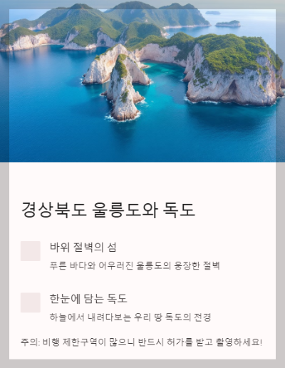 주의: 울릉도와 독도는 드론 비행이 제한된 곳이 많으니까, 꼭 허가를 받고 촬영해야 해요!
