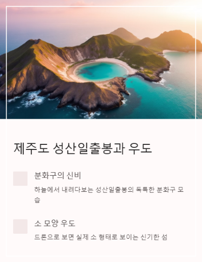 팁: 성산일출봉은 해 뜨기 30분 전에 미리 준비하고, 우도는 오후 햇살이 예쁠 때 촬영하면 최고예요!