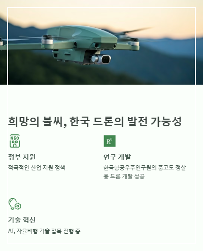 최근 몇 년간 정부 차원에서 적극적으로 드론 산업 지원 정책을 펼치고 있으며, 기업들도 AI, 자율비행, 첨단 센서 기술 등 핵심 기술 개발에 박차를 가하고 있다.