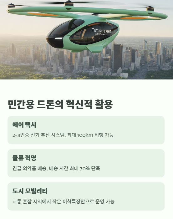 도시 교통의 3차원적 확장은 물론, 응급 의료 서비스, 환경 모니터링, 재난 대응 등 다양한 분야에서 혁신을 가져올 것입니다.