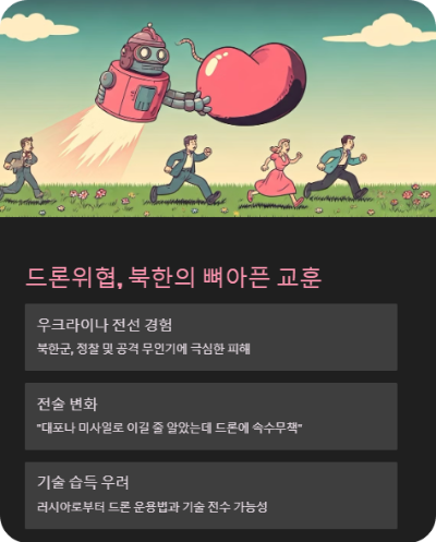 사실 러시아가 우크라이나 전역에서 드론을 광범위하게 운용하고, 북한군까지 그 전장에 투입한 건 이미 공공연한 비밀 수준이죠. 만약 북한이 그 경험을 토대로, 러북군사협력 형태로 무인기 기술을 공급받고 있다면, 남한에겐 매우 불리한 시나리오가 됩니다.