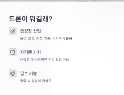 게다가 요즘은 드론 자격증까지 뜨겁습니다. 대학생 때 시작하면 진로와 창업 기회까지 연결 가능!