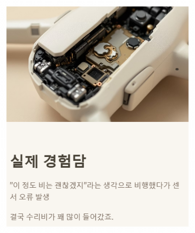 어느 날 갑작스럽게 비가 내리기 시작했는데, 저도 모르게 "이 정도 비는 괜찮겠지"라는 마음으로 드론을 띄웠다가 비싼 교훈을 얻은 적이 있답니다.