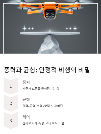 ⚖️ 4가지 힘의 균형: 안정적인 비행의 비밀 드론이 안정적으로 비행하기 위해서는 네 가지 힘이 균형을 이루어야 합니다.