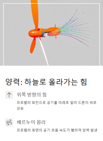 드론의 프로펠러가 회전하면서 공기를 아래로 밀어내면, 반작용으로 드론은 위로 밀려 올라갑니다.