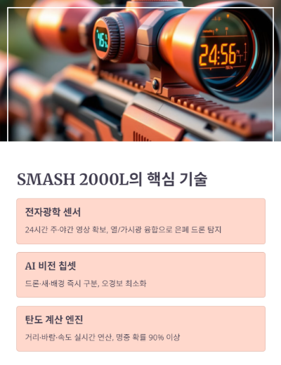 1. SMASH 2000L이란? – 구조와 특징 구성 모듈 기능 실전 이점 전자광학 센서 24 시간 주·야간 영상 확보 열/가시광 융합으로 은폐 드론 탐지 AI 비전 칩셋 드론·새·배경 즉시 구분 오경보 최소화 탄도 계산 엔진 거리·바람·속도 실시간 연산 명중 확률 >90 % (시범 사격 기준) 트리거 인터페이스 “발사 허용” 신호만 출력 오발·낭탄 방지로 탄약 ↓