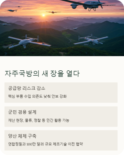 군용 드론 기술이 해외에 종속되지 않고 자국 기반으로 구축된다는 건 “유사시 소모품이나 업그레이드를 자유롭게 조달할 수 있다”는 뜻이고, 이는 곧 자주국방 역량을 한 단계 끌어올리는 계기가 됩니다.